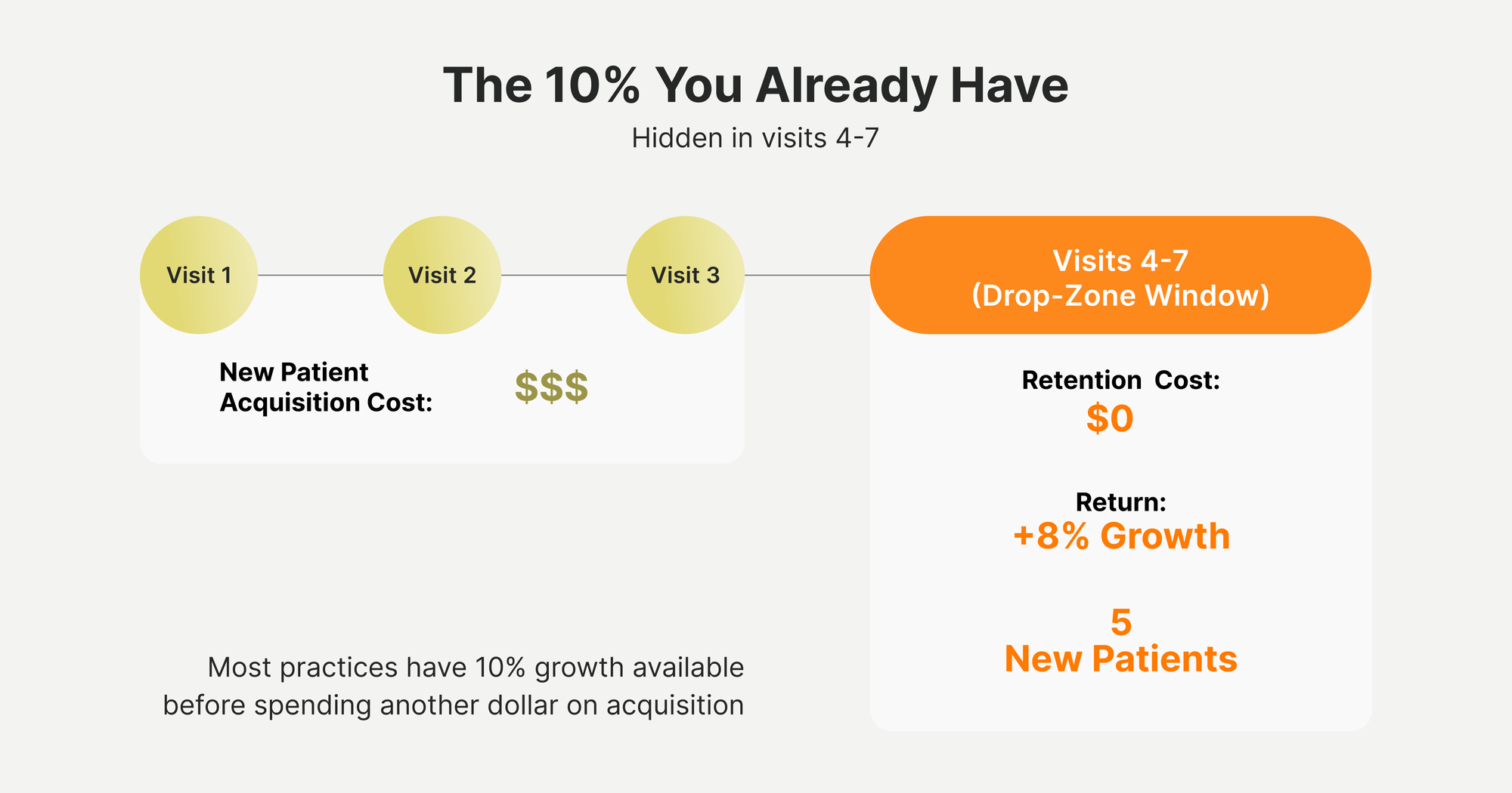 - Most practices have 10% growth available through experience optimization before spending another dollar on new patient acquisition