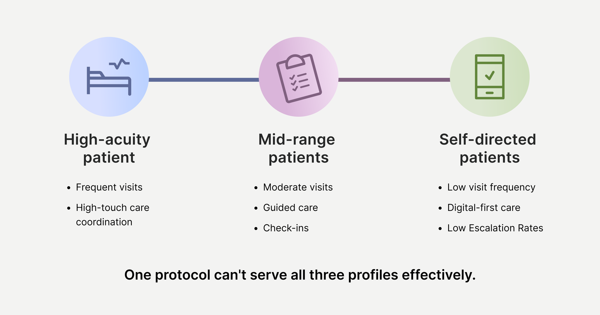 Matching care intensity means designing treatment protocols around what each patient clinically requires, not what billing rules optimize. A post-surgical ACL patient needs frequent in-clinic contact with manual treatment and supervised progression. A chronic low back pain patient who's been through PT before needs expert guidance, a self-directed program, and accountability check-ins.