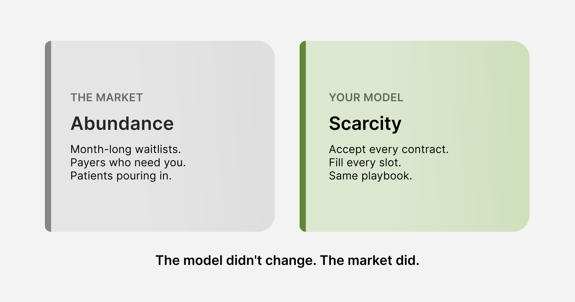 Favorable market tailwinds cover up the cracks in the entire system’s foundation at the unit economics level. Practices that feel busy and solvent today may be running models that become unsustainable over years. The current demand gives practices the negotiating position they've never had before. This is their chance.